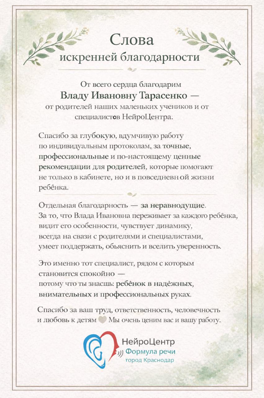 Дорогая и уважаемая, Влада Ивановна и коллеги центра. От всего сердца благодарим за уникальную, единственную в своём роде программу восстановления речи. У внука был диагноз сенсоневральная алалия. Начиная с 4-х лет постепенно прослушали 1 , затем 2 курс программы Логопед-дефектолог и потом Школьник-интеллект. Результаты говорят сами за себя. Сейчас внук учится во 2 классе ОБЫЧНОЙ ОБЩЕОБРАЗОВАТЕЛЬНОЙ ШКОЛЫ. Он - ОТЛИЧНИК!!! Мы - СЧАСТЛИВЫ! СПАСИБО ЗА ТО, ЧТО ВЫ ЕСТЬ, ЗА РАБОТУ И ПОСТОЯННОЕ СОПРОВОЖДЕНИЕ ДО ПОЛУЧЕНИЯ УДИВИТЕЛЬНЫХ РЕЗУЛЬТАТОВ! РЕКОМЕНДУЮ ВАС ВСЕМ СВОИМ УЧЕНИКАМ И ЗНАКОМЫМ! От души желаем ВСЕМУ КОЛЛЕКТИВУ КРЕПКОГО ЗДОРОВЬЯ, СЧАСТЬЯ, БЛАГОПОЛУЧИЯ ! ХРАНИ ВАС ГОСПОДИ ♡