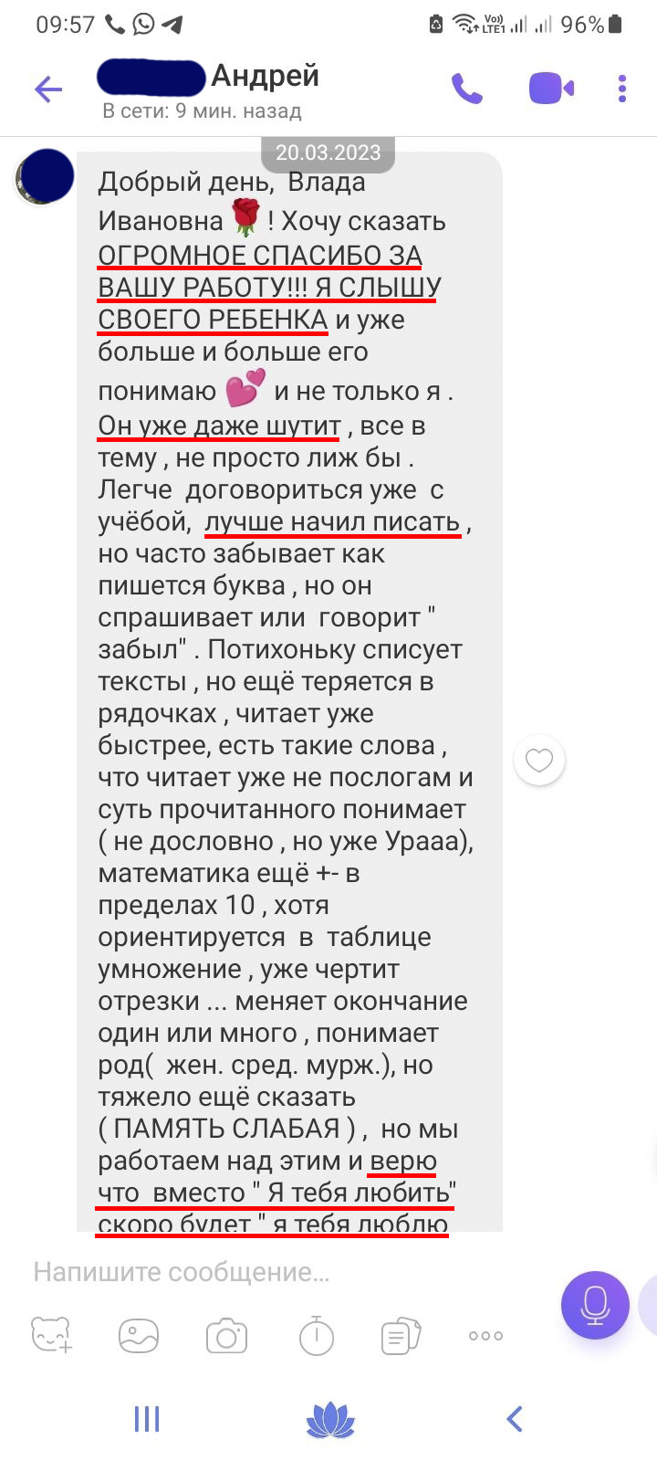 Дорогая и уважаемая, Влада Ивановна и коллеги центра. От всего сердца благодарим за уникальную, единственную в своём роде программу восстановления речи. У внука был диагноз сенсоневральная алалия. Начиная с 4-х лет постепенно прослушали 1 , затем 2 курс программы Логопед-дефектолог и потом Школьник-интеллект. Результаты говорят сами за себя. Сейчас внук учится во 2 классе ОБЫЧНОЙ ОБЩЕОБРАЗОВАТЕЛЬНОЙ ШКОЛЫ. Он - ОТЛИЧНИК!!! Мы - СЧАСТЛИВЫ! СПАСИБО ЗА ТО, ЧТО ВЫ ЕСТЬ, ЗА РАБОТУ И ПОСТОЯННОЕ СОПРОВОЖДЕНИЕ ДО ПОЛУЧЕНИЯ УДИВИТЕЛЬНЫХ РЕЗУЛЬТАТОВ! РЕКОМЕНДУЮ ВАС ВСЕМ СВОИМ УЧЕНИКАМ И ЗНАКОМЫМ! От души желаем ВСЕМУ КОЛЛЕКТИВУ КРЕПКОГО ЗДОРОВЬЯ, СЧАСТЬЯ, БЛАГОПОЛУЧИЯ ! ХРАНИ ВАС ГОСПОДИ ♡